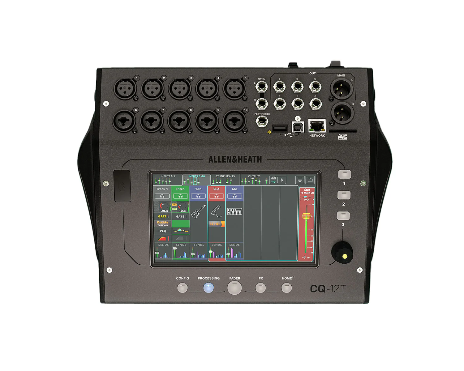 CQ-12T gives you all the connectivity you need to get going with 10 mic/line inputs split across 5 XLRs and 5 XLR/TRS combi sockets, plus a stereo input via a pair of 1/4″ jacks. When it comes to outputs, there’s a pair of main mix outputs on XLR plus 6 TRS jack outputs for monitor mixes – enough for the whole band!