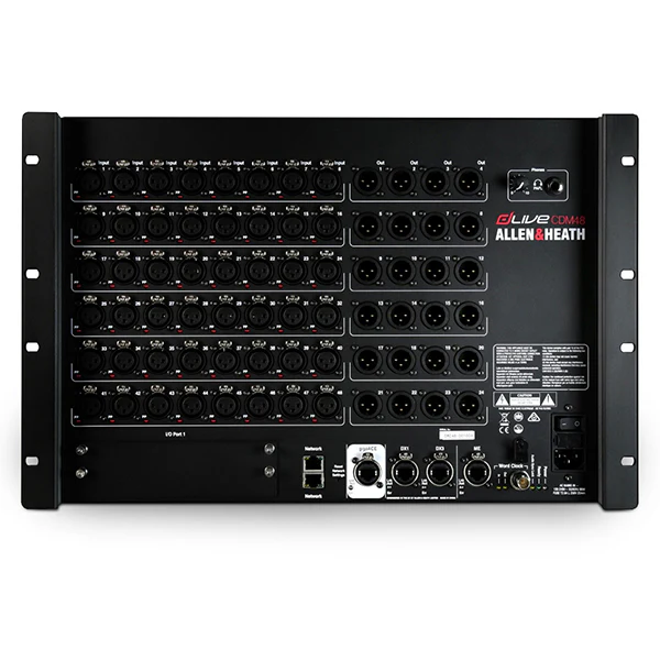 The CDM48U dLive Mixrack / Mainframe has 48 analog inputs and 24 analog local I/O outputs.