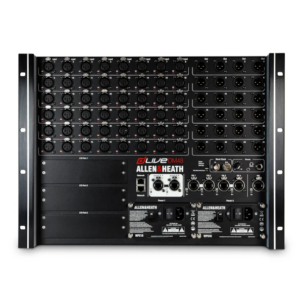 The DM48U dLive Mixrack / Mainframe has 48 analogue inputs and 24 analogue outputs of local I/O.