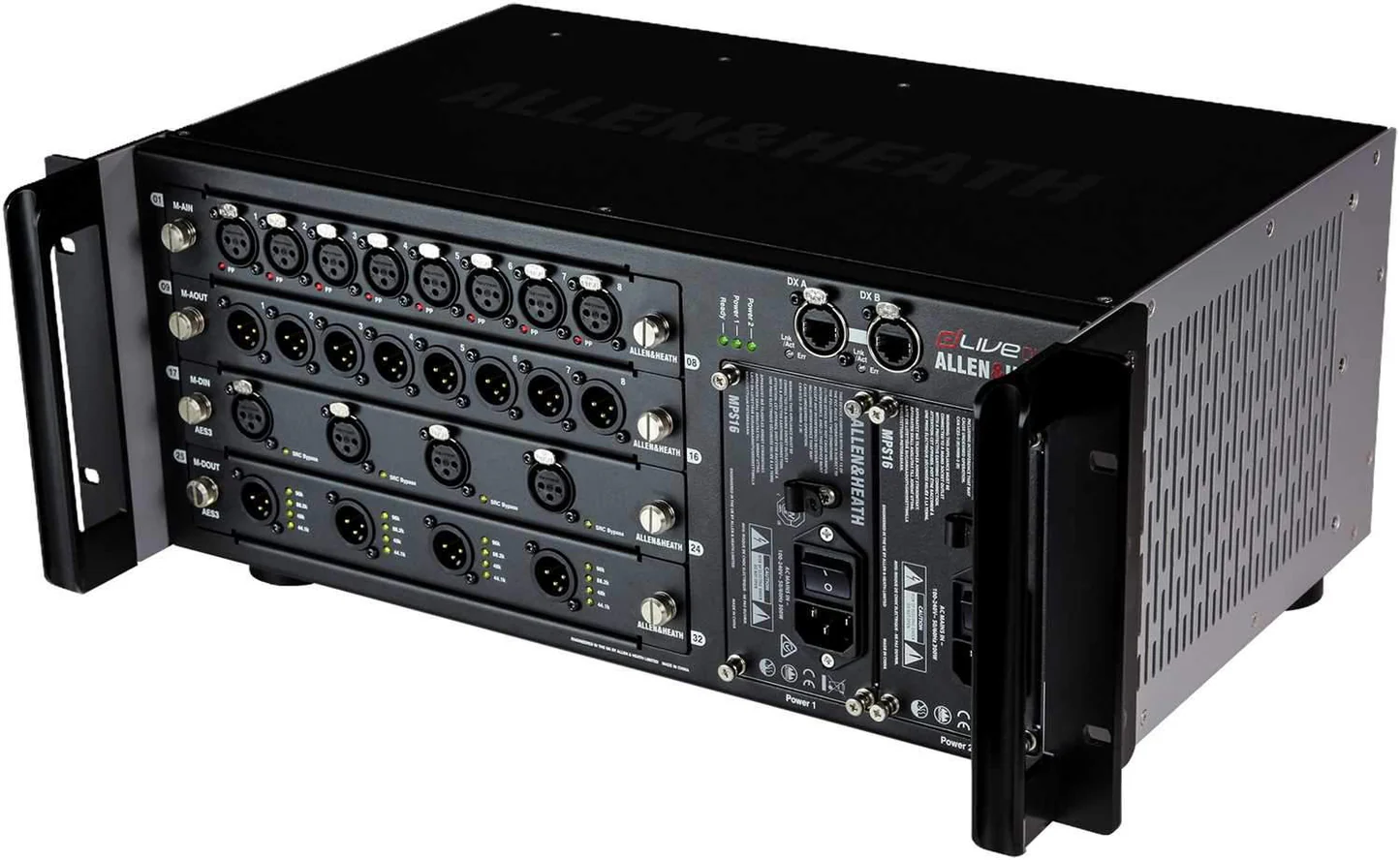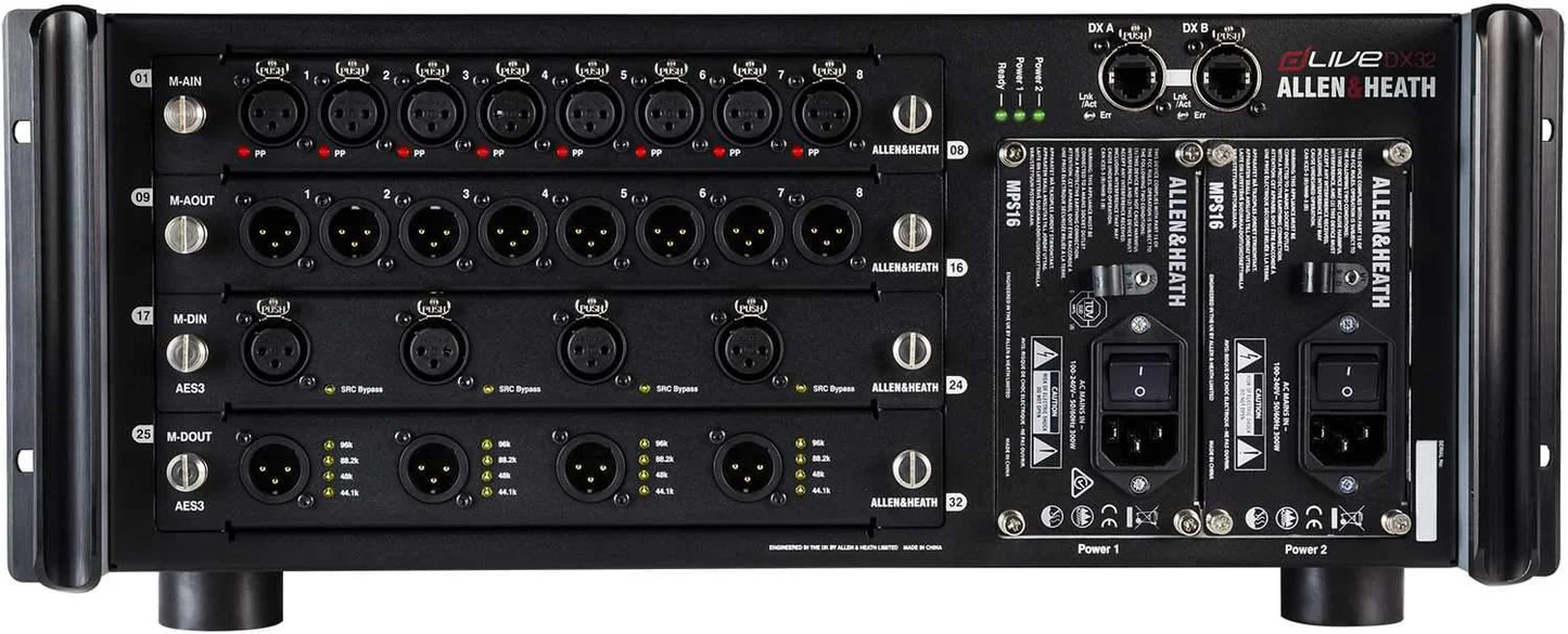 The DX32 Expander adds remote, modular I/O to a dLive system. It provides 4x 8 channel slots to fit a selection of analogue or digital I/O. Up to 2 DX32 Expanders can be connected to the MixRack, and a further DX32 can be connected to the Surface.