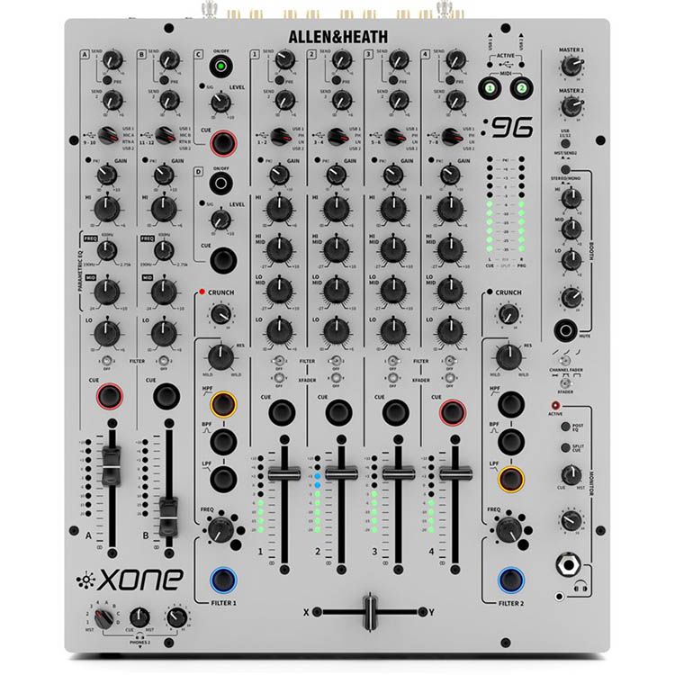 The Allen & Heath Xone:96 is a new 4-channel DJ mixer that inherits the same audio architecture as the Xone:92 mixer but with brand new state-of-the-art digital connectivity as well as a detailed analogue sound that only the Xone range can deliver. This professional DJ mixer is perfect for club installations, home DJ setups, as well as mobile and traveling DJs.The Xone:96 is Allen & Heath’s most advanced DJ mixer and has been re-engineered to give you the legendary Xone sound in the most versatile format. The Xone:96 comes with the same intuitive layout as the Xone:92 but with some additional controls for the stereo return channels A and B such as a 3-band parametric EQ and channel faders for smoothly dialling in your outboard effects processors and gives you even more control for styling your sound. The four main stereo input channels come fitted with the industry-standard Xone 4-band EQ allowing you to precisely control high, mid, low-mid, and low frequencies.