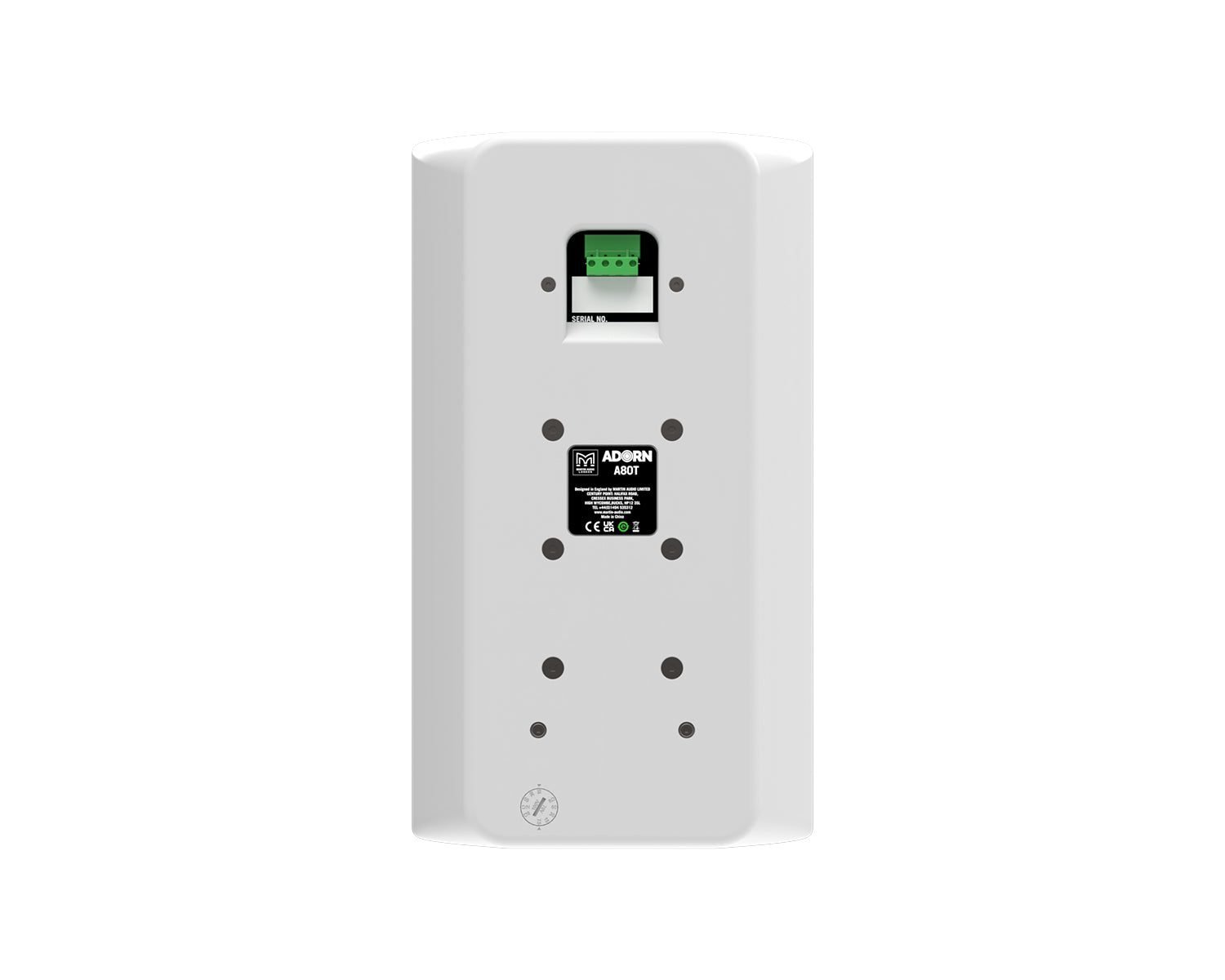 The ADORN A80T is a two-way passive speaker with an elegant design that is perfect for architectural environments that require high fidelity sound from an unobtrusive, compact enclosure. It brings class-leading performance, reliability and value to a wide range of commercial sound applications ‚Äî from retail outlets, bars and restaurants to corporate offices and convention centres.Comprising an 8″ (203mm) LF driver and a 1″ (25mm) polymer dome HF compression driver on a 90¬∞ x 50¬∞ horn, it handles 200W AES, 800W peak and can produce 120dB peak output at 1 metre. It has a smooth frequency response and strong bass reproduction that extends down to 63Hz.With a nominal impedance of 8 ohms, multiple speakers can be driven in parallel from a single channel of a low impedance amplifier, such as the Martin Audio VIA2502 or VIA5002, thereby maximising efficiency and minimising cost. A80T also incorporates a high-quality transformer for 70V/100V line operation, with transformer taps selected by a rotary switch.