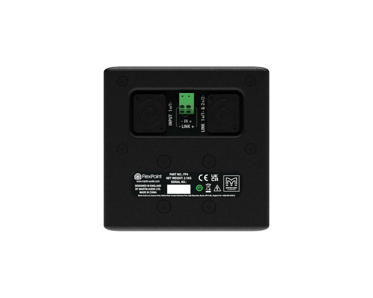 *The FlexPoint Series MUST be used with Martin Audio DX Network System controllers or iKon Amplifiers, if FlexPoint is used without these, the Speakers will not perform to spec and the Warranty will be Void.The FP4 is a point-source loudspeaker designed for short-throw distributed systems which require premium sound quality from a miniature enclosure. It delivers exceptional output and performance for its size and is ideal for installations requiring spot and fill coverage where space is limited. With a wide and smooth frequency response, it reproduces both speech and music effortlessly.Its miniature size and flexible mounting options, including mic stand, make for discreet integration within any setting ‚Äî from small stages, churches, museums and galleries to theatres, bars and restaurants. Being both portable and surprisingly powerful for its size, it can also be used for corporate AV events and as a fill loudspeaker within a larger sound system. When supplemented by a subwoofer, it is also an excellent choice for a premium background music system in a wide variety of venues.The FP4 is a two-way passive design featuring a 4″ LF driver and a 0.7″ exit HF driver with a 1″ diameter high-temperature polymer dome. It has an impressive maximum SPL of 108dB peak, and its Coaxial Point Source configuration produces a well-defined, conical 110¬∞ dispersion pattern which is perfect for close proximity applications.Its durable birch plywood enclosure is finished in hardwearing textured paint and incorporates threaded inserts for U-bracket, wall bracket and mic stand mounting. A steel grille with a triple-layer polyester backing presents a discreet, professional appearance, while resisting dust and water ingress to IP54 environmental rating.FP4 can be powered by iKON amplifiers, or by VIA amplifiers when used with a DX4.0 controller, or alternatively a DX0.4 or DX0.6 controller. FP4 systems can be modelled in 3D using Display 3 design and prediction software