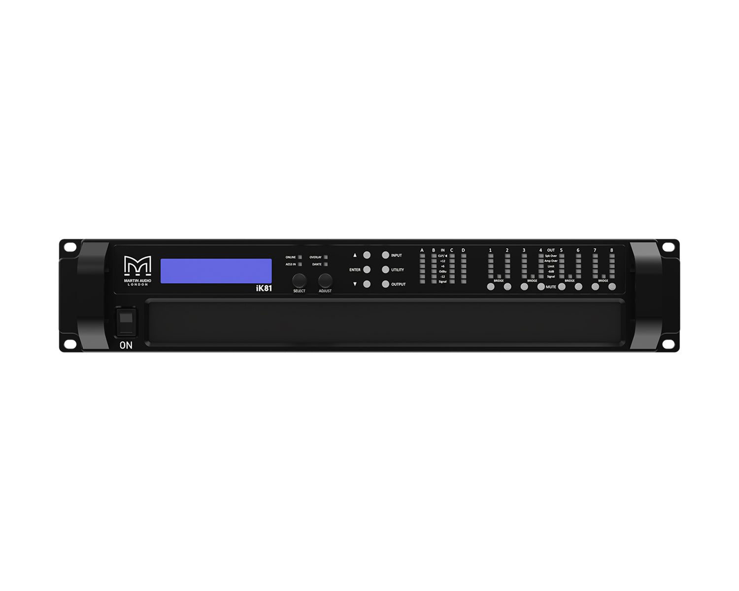 The iKON iK81 is an advanced 8-channel power amplifier which combines very high power density with superb audio performance, state-of-the-art DSP and network control. A dedicated controller amplifier for the Martin Audio Wavefront Precision WPM line array, the iK81 can also provide multi-channel amplification across the Martin Audio loudspeaker range.The iK81 can deliver a full 1250 watts per channel into 2, 4 or 8 ohms with all channels driven while remaining highly efficient. Its high efficiency reduces the energy drawn from the mains supply and ensures the power reserves needed to deliver superb sound under arduous live conditions.Ethernet is used for system remote control and monitoring via Martin Audio’s VU-NET software application, while a user friendly front panel interface allows full local control of all features. Dante digital audio network inputs are also provided for digital audio distribution and control.Powerful DSP is fully integrated into the iK81 to provide a multitude of features. It also provides up to 1000 FIR filter taps @ 48kHz on each output channel, which is essential to implement DISPLAY’s wide bandwidth optimisation process in the WPM line array.The iK81 employs comprehensive protection functions to maintain safe operating conditions of both the amplifier and the loudspeakers driven ‚Äî including a sophisticated loudspeaker limiter suite which incorporates peak, RMS and excursion limiting, as well as multiband limiting for passive 2-way systems.