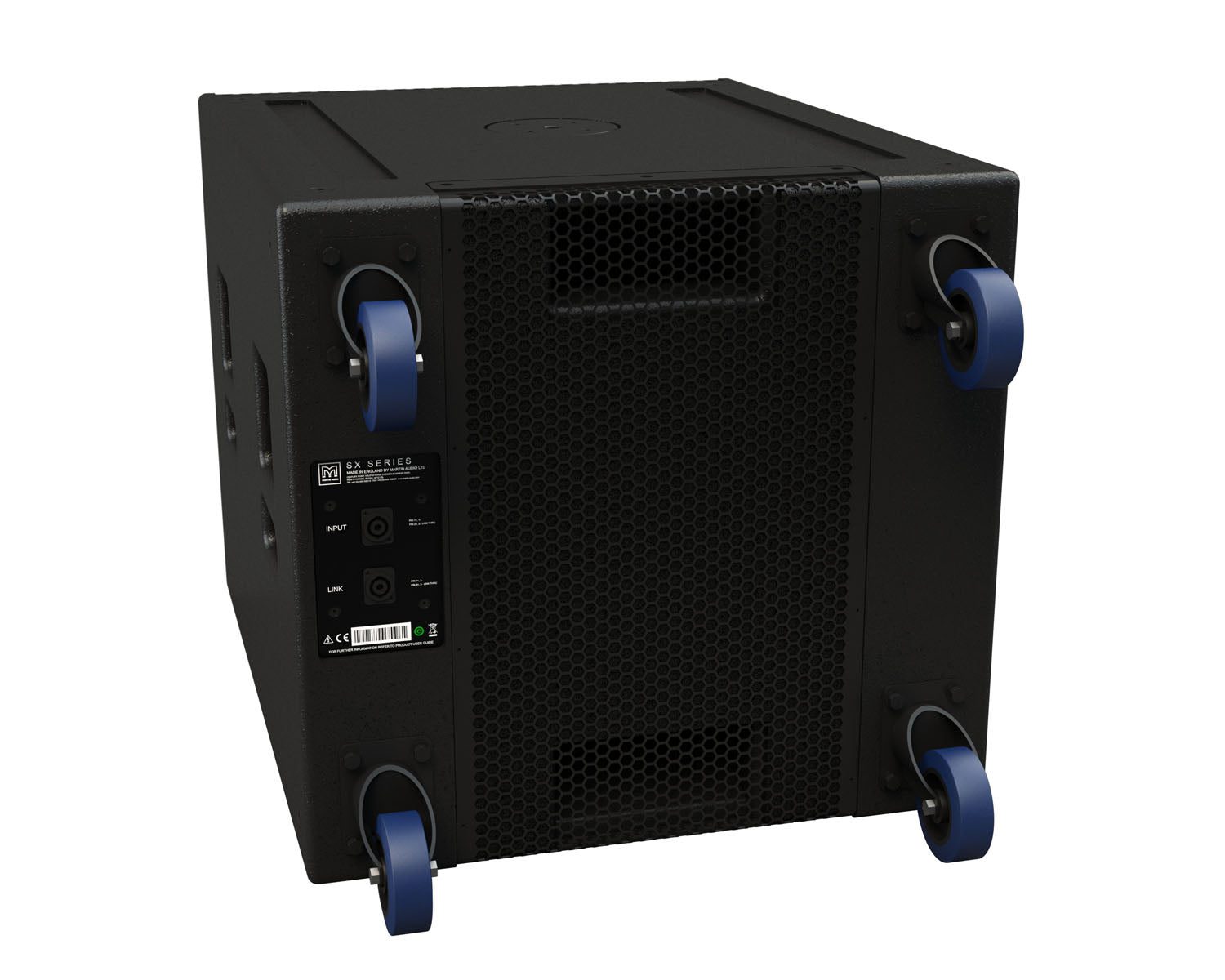 Designed for touring sound and installations, the SXC118 is a compact, high performance cardioid subwoofer. It features an 18″ (460mm) forward facing driver and a 14″ (356mm) rear facing driver, each driven independently by separate amplifier channels and DSP.The recommended iK42 amplifier optimises the DSP parameters for front and rear drivers to maximise the rear rejection ‚Äî from 21dB at 43Hz to 28dB at 75Hz. This keeps low frequencies away from stages, turntables and walls as well as reducing reverberant energy in the room, greatly improving the system’s low frequency response accuracy and impact.In front of the enclosure, the output from the two drivers is additive, giving an extra 2dB of output when compared with a conventional 1 x 18″ subwoofer.The enclosure is constructed from plywood and finished with a hard-wearing textured paint. It is equipped with four grab handles and foam-backed perforated steel grilles protect the front and rear drivers. It can be used individually, stacked or flown individually by means of threaded flying inserts.