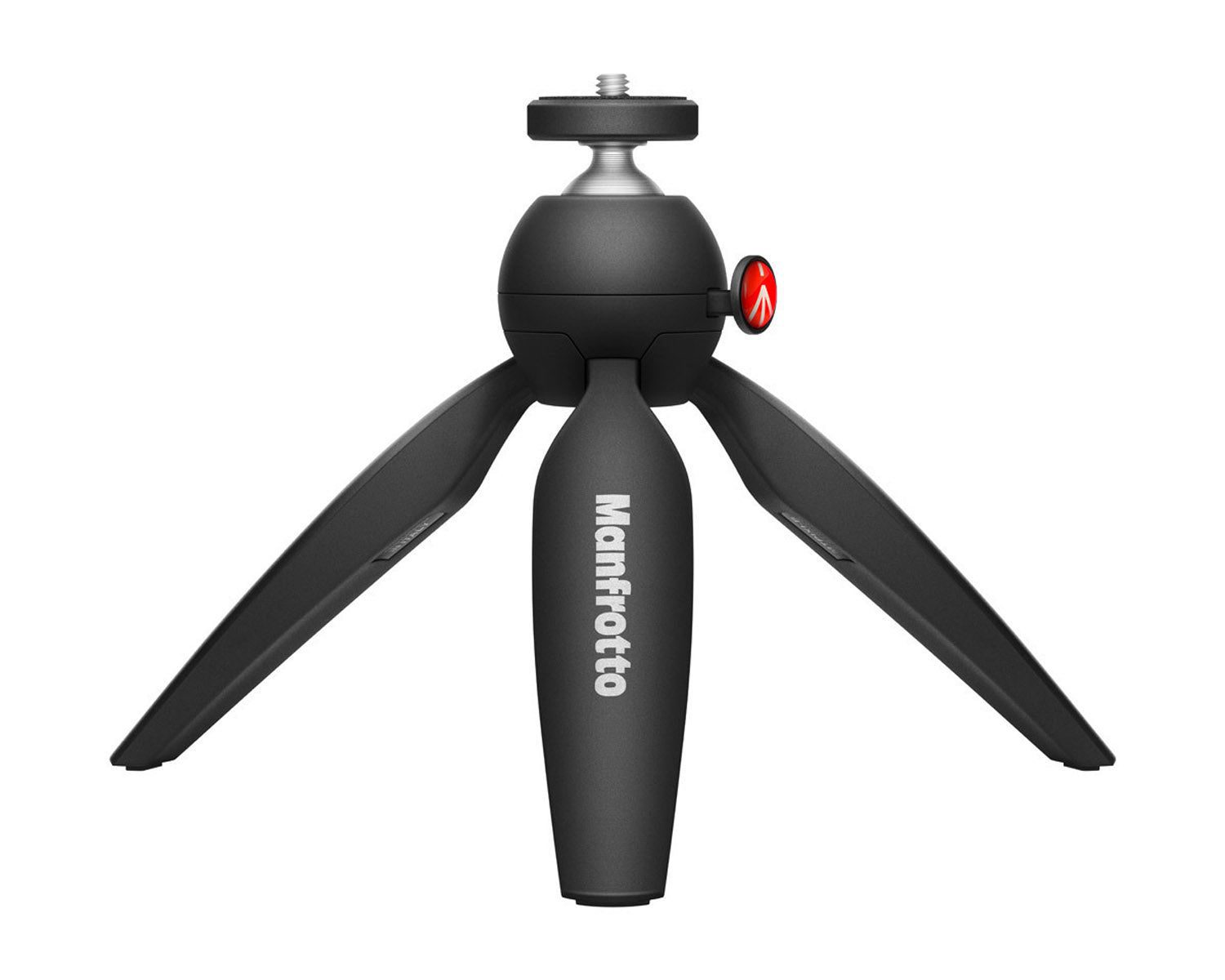 - Manfrotto PIXI Mini Tripod features a push-button locking ball head for desired placement