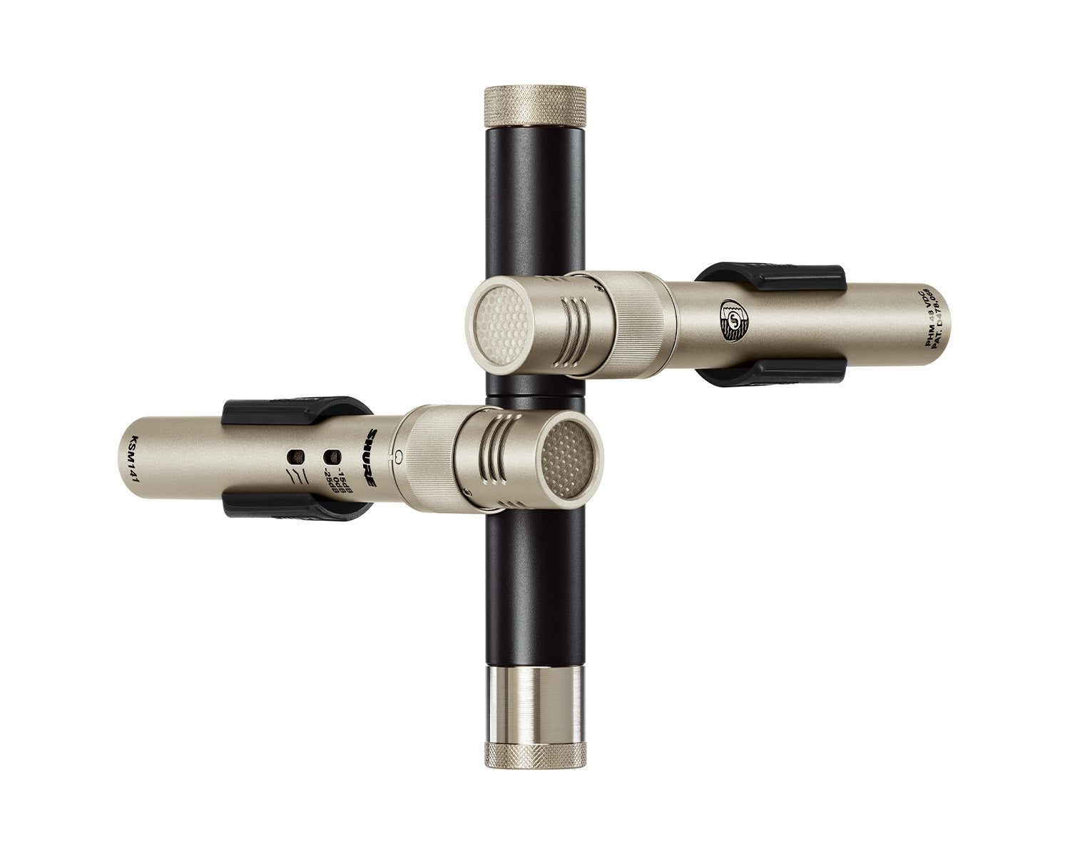 The Shure® KSM141 is a premium, end-address, condenser microphone with a unique rotating collar that allows for easy switching between a highly consistent cardioid or true omnidirectional polar pattern. Its class A, discrete, transformerless preamplifier captures an extremely transparent sound, and a three-position attenuation switch and low-cut filter allow for handling of extremely high sound pressure levels (SPL) and controlled bass response. An ultra-thin, 24-karat gold-layered diaphragm and superior build quality make the KSM141 ideal for studio use, yet rugged enough for the most demanding live applications.Stereo microphone techniques give depth and spatial placement to sound sources for broadcasting, recording, or sound reinforcement applications. The Shure A27M allows you to mount two microphones on a single stand with a wide range of angles and vertical separations for a variety of coincident and closely-spaced stereo configurations.