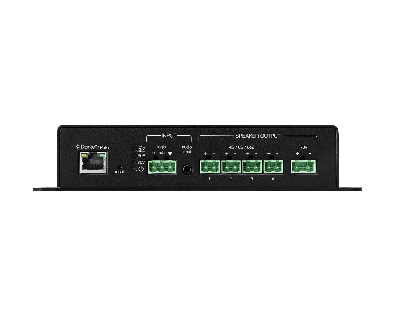 - Audio Outputs: 4 Dante output channels, 4 LoZ loudspeaker outputs, 1 70V loudspeaker output
