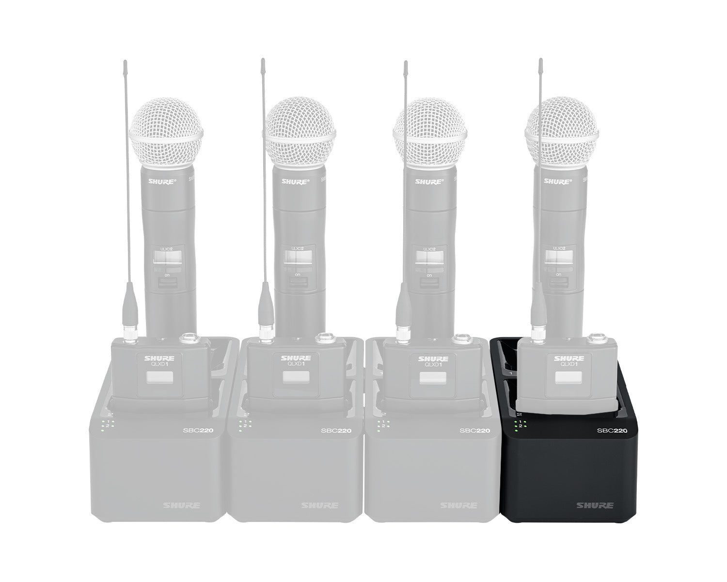 The SBC220 2-Bay Networked Charging Station enables docked charging and storage for any combination of two sb900b batteries or ULXD1, QLXD1, AD1 (bodypack) or ULXD2, QLXD2 or AD2 (handheld) wireless transmitters. When the connected to a network, the charging status of each transmitter can be viewed remotely while the transmitters are in the charger, using Shure Wireless Workbench® Management software. Up to four SBC220 units can be linked together to share power and network connectivity.