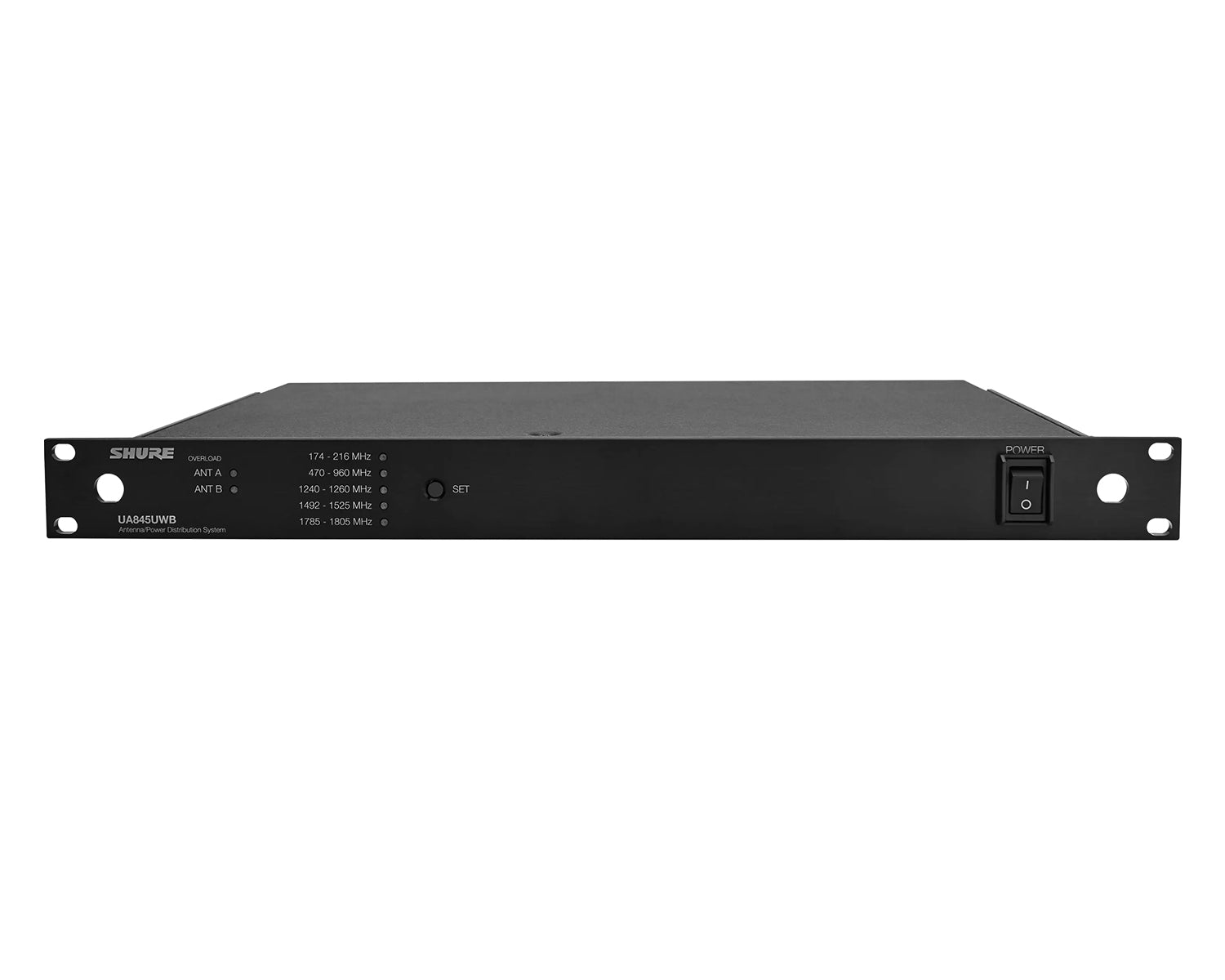 The Shure Model UA845UWB is an amplified, VHF and UHF Antenna Distribution System that expands a wireless microphone system by splitting one pair of antennas to multiple Shure Axient Digital, UHF-R, ULX-D, BLX4R, SLX4 and BLX4R. It also amplifies RF signals to compensate for insertion loss due to splitting signal power to multiple output connectors. Each UA845UWB allows up to four receivers to use the same antennas. CASCADE connectors allow connections to a fifth receiver or a second UA845UWB.
